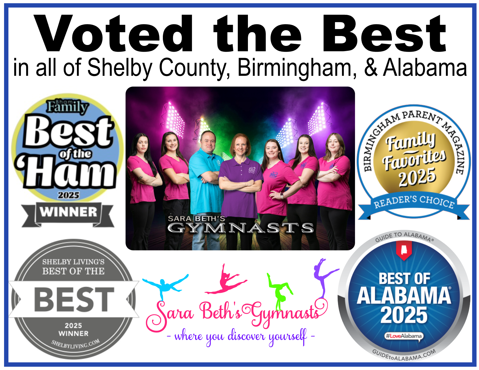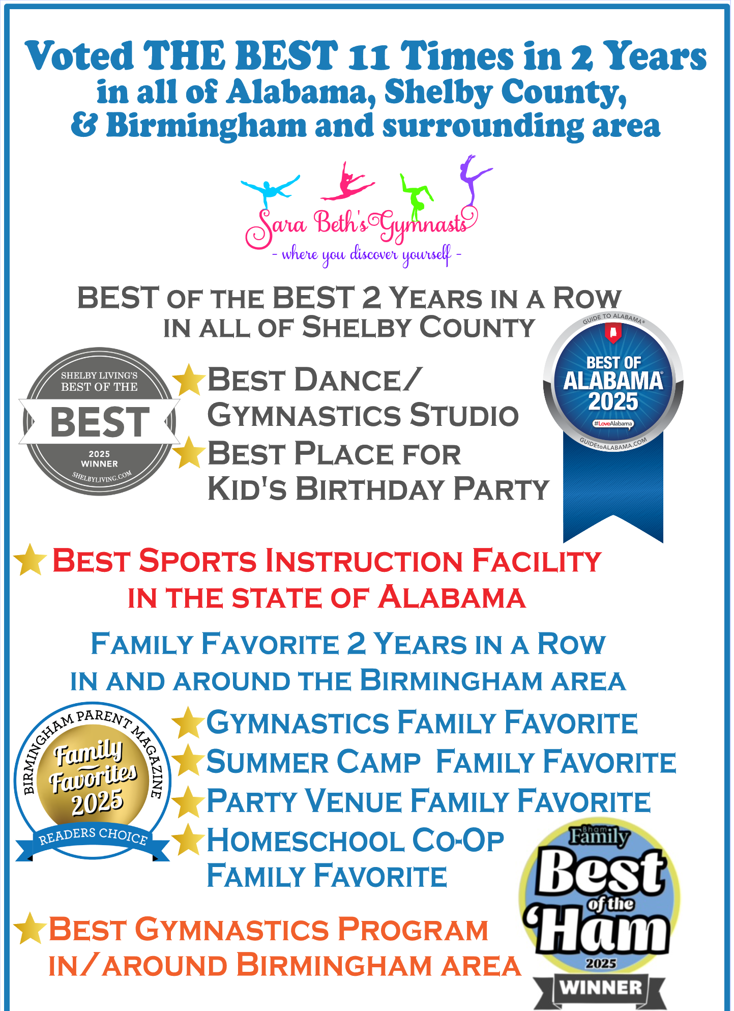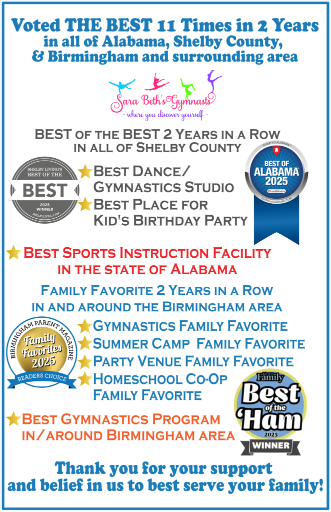 It is an incredible honor to be awarded the recognition of Best Sports Instruction Facilities in Alabama and to again be voted Best Dance/Gymnastics Studio and Best Place for a Kid’s Birthday Party in Shelby County as well as Best Gymnastics Program in Birmingham plus Family Favorite in Gymnastics twice, Summer Camp, Party Venue, and Homeschool Co-Op. We appreciate your trust, support, and friendship as we truly enjoy serving our community with quality personalized instruction, caring and educated staff, a clean and safe learning environment, fun, and positive confidence-boosting encouragement and enthusiasm. Thank YOU for selecting us as BEST of the BEST and Family Favorite! It’s not about just gymnastics. We specialize in child development nurturing every part of each person who attends our classes including their physical, mental, psychological, and emotional health and well-being.