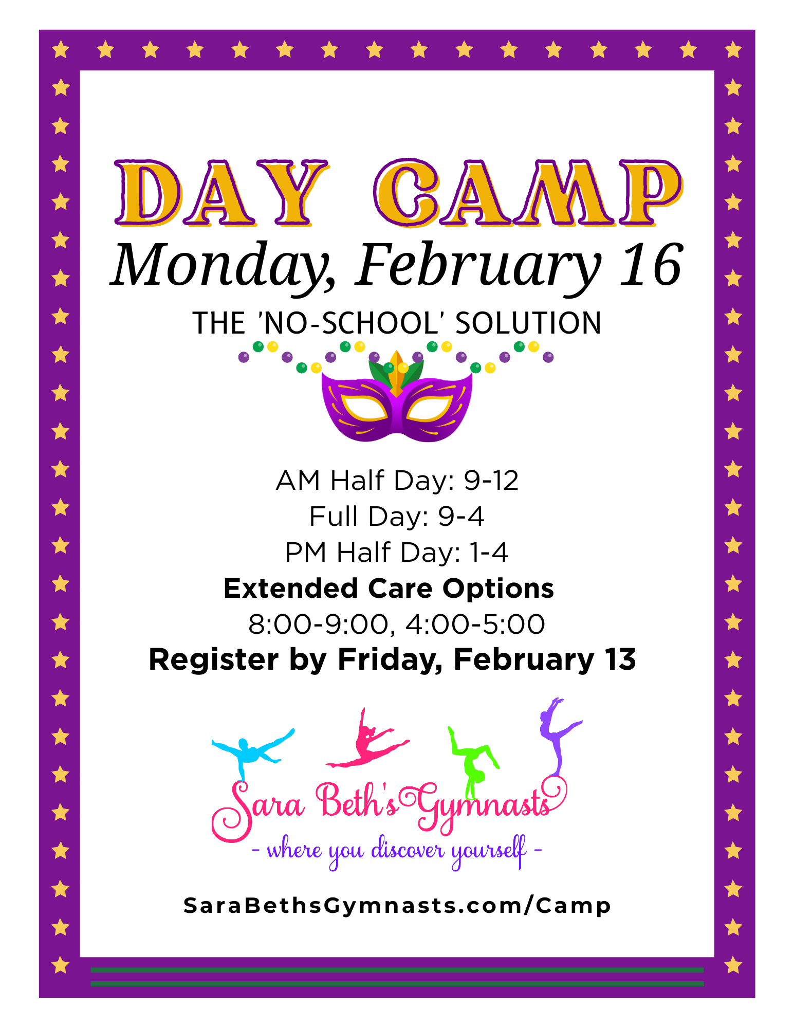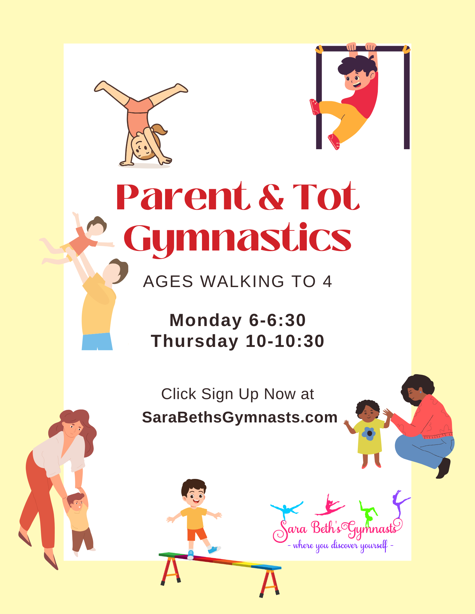 Welcome to Sara Beth’s Gymnasts where you discover yourself. We have a growing gymnastics community in Chelsea, Alabama, and welcome you to join us. Start your little one with a parent in our Parent and Tot Gymnastics classes and let them grow into a confident and coordinated gymnast. All ages girls and boys through adults of any age and skill level welcome. Start at any age. You’ll be glad you did.