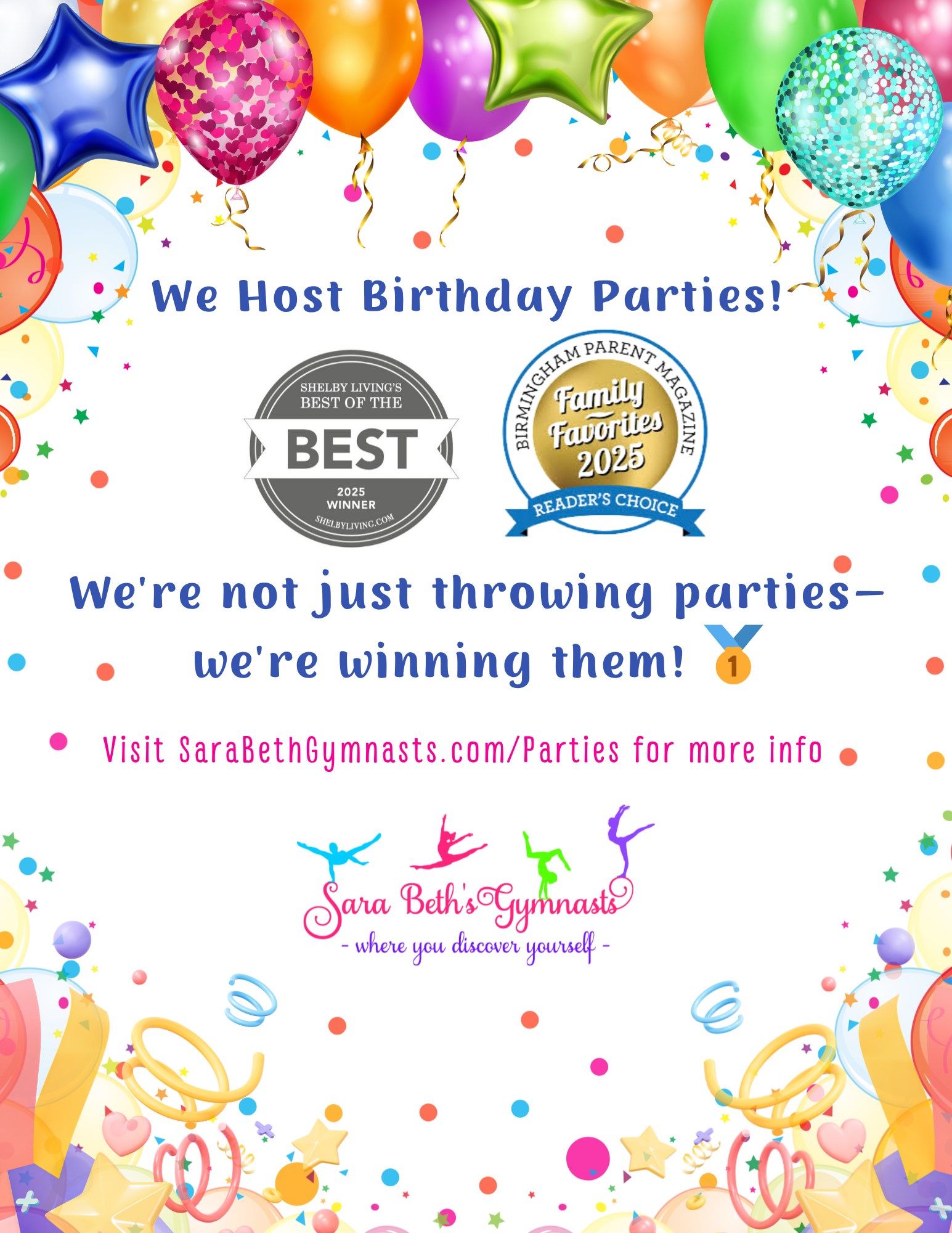 It is an incredible honor to be awarded the recognition of Best Sports Instruction Facilities in Alabama and to again be voted Best Dance/Gymnastics Studio and Best Place for a Kid’s Birthday Party in Shelby County as well as Best Gymnastics Program in Birmingham plus Family Favorite in Gymnastics twice, Summer Camp, Party Venue, and Homeschool Co-Op. We appreciate your trust, support, and friendship as we truly enjoy serving our community with quality personalized instruction, caring and educated staff, a clean and safe learning environment, fun, and positive confidence-boosting encouragement and enthusiasm. Thank YOU for selecting us as BEST of the BEST and Family Favorite! It’s not about just gymnastics. We specialize in child development nurturing every part of each person who attends our classes including their physical, mental, psychological, and emotional health and well-being.