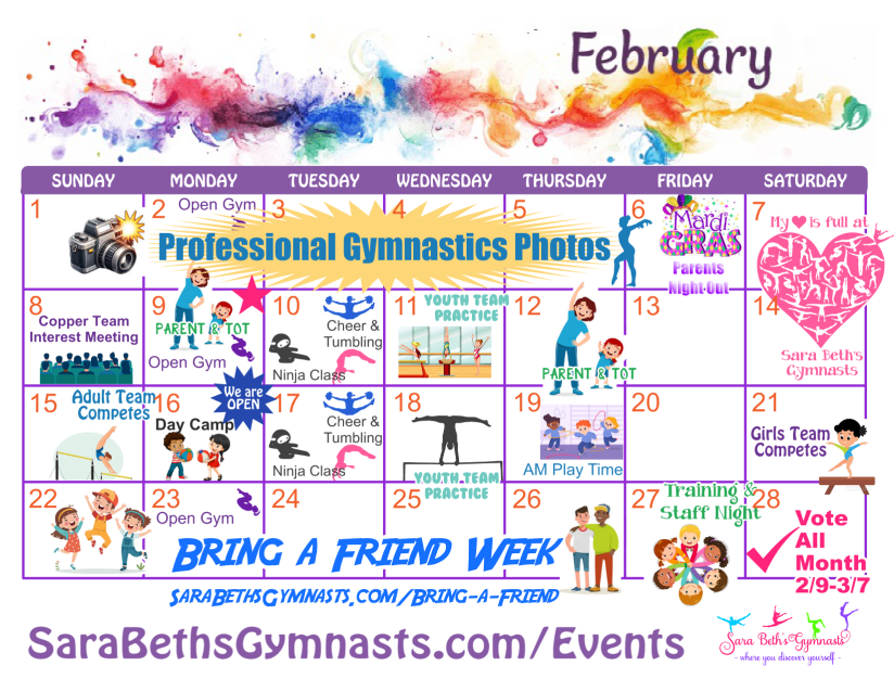 We’re excited to offer homeschool educational classes including Spanish and Sign Language plus Ninja Gymnastics, Boys Gymnastics, Tumbling, Cheer, Adult Gymnastics, Pre-Team Gymnastics, Competitive Team Gymnastics, Adult Competitive Team Gymnastics, private lessons, private parties, and much more! Visit the Schedule page to see days and times. Registration is open. Please contact us if you’re interested or start registration now. Check out all our fun Events too!