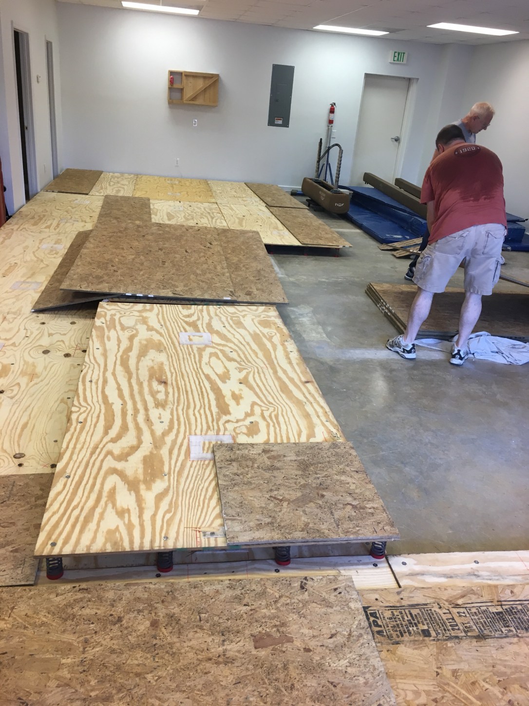 Whew! It’s been a very long day of setting up equipment just 1 day before its unveiling. It doesn’t look like it should take so long, but everything had to be done in a certain order and the spring floor had to be first. It took about half of the day to set up and assemble the spring floor. Slowly, things started falling into place and eventually looking like a gym.