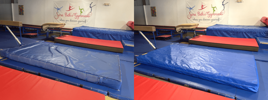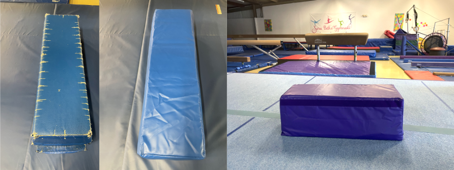 I’m so thankful for the extra funds for the covers because now we can eliminate all the tiny fuzz and duct tape; replace all the worn and torn Velcro on our blocks; add Velcro to all of our trapezoids and a big mat to secure them for stacking and on the spring floor; add much needed handles for moving mats; and prevent the vinyl from further shredding during their long and useful lives.