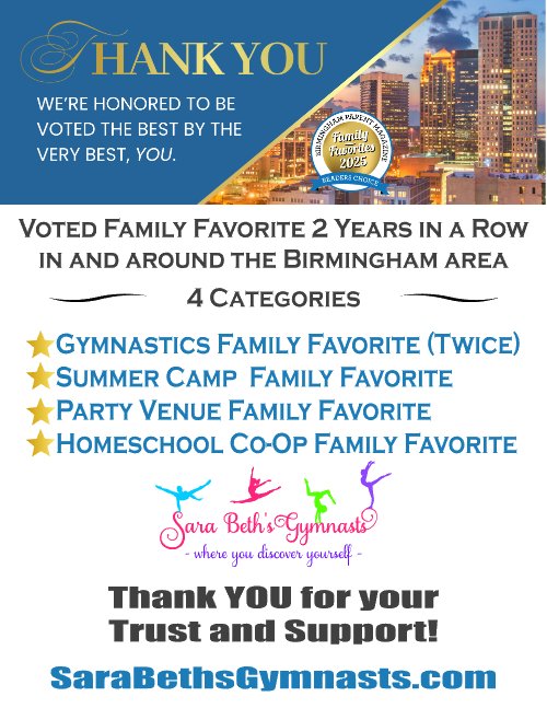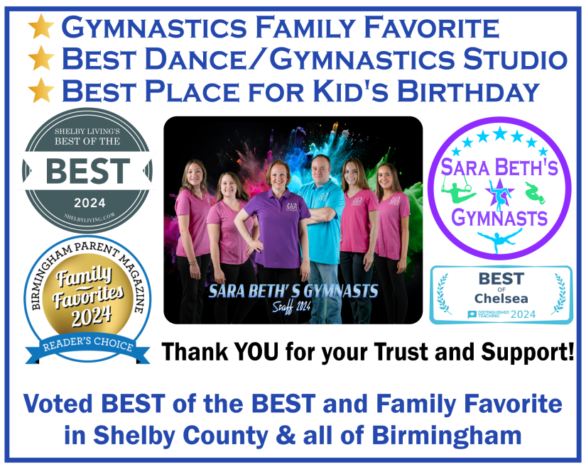 Sara Beth’s Gymnasts has received several awards. We are grateful for our community believing in us and trusting us with your wonderful children! Your unwavering support and positive reviews mean the world to this family-owned and operated small business serving our local community. We are stronger together!