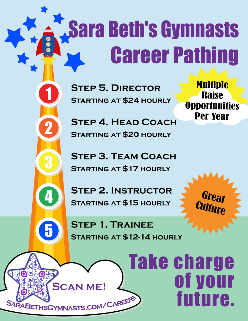 Since opening in Chelsea, Alabama, in January of 2018, we have not stopped growing. We have a passionate staff who love to work with children and we are looking for more staff who want to call Sara Beth’s Gymnasts home. These career opportunities provide you with a career you can love showing up for. You can make a real difference for our youth. We have a variety of positions available for ages 16+.
