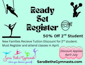 Please begin registration at Sara Beth’s Gymnasts Registration where you will complete forms, your Parent Portal account, waivers, and payment information along with selecting your class(es). I’m excited to have you join us!