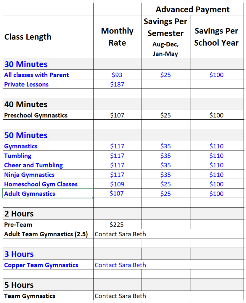 Prices listed on the Class Schedule are monthly rates. You receive discounts when you pay for the semester or for the school year, have multiple classes, or have multiple children enrolled. All discounts are calculated during registration.